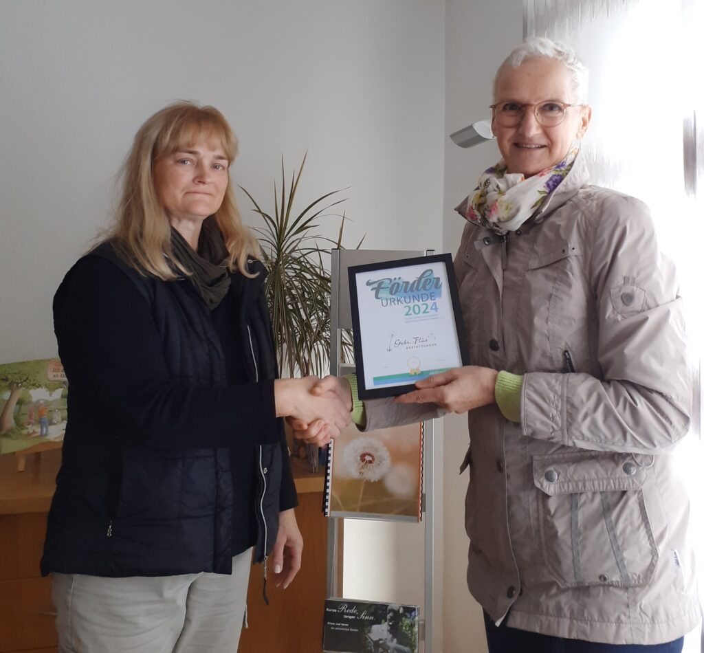 Schreinerei Flüs unterstützt auch in 2024 aktiv55plus.Ganz herzlichen Dank dafür!Und als Ausdruck unseres Dankes überreichten wir gerne die Förderurkunde 2024.